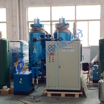 液氮機(jī)設(shè)備是根據(jù)變壓吸附原理,采用高品質(zhì)的碳分子篩作為吸附劑,在一定的壓力下,從空氣中制取氮?dú)?。?jīng)過(guò)凈化干燥的壓縮空氣,在吸附器中進(jìn)行加壓吸附、減壓脫附。由于動(dòng)力學(xué)效應(yīng),氧在碳分子篩微孔中擴(kuò)散速率遠(yuǎn)大于氮,在吸附未達(dá)到平衡時(shí),氮在氣相中被富集起來(lái),形成成品氮?dú)?。然后減壓至常壓,吸附劑脫附所吸附的氧氣等其它雜質(zhì),實(shí)現(xiàn)再生。一般在系統(tǒng)中設(shè)置兩個(gè)吸附塔,一塔吸附產(chǎn)氮,另一塔脫附再生,通過(guò)PLC程序自動(dòng)控制,使兩塔交替循環(huán)工作,進(jìn)行氧氮吸附分離,從而得到合格的氮?dú)猓龠M(jìn)入風(fēng)冷無(wú)油循環(huán)壓縮機(jī)和液化設(shè)備,使氮?dú)鈴臍鈶B(tài)變換成液態(tài)得到液態(tài)氮。